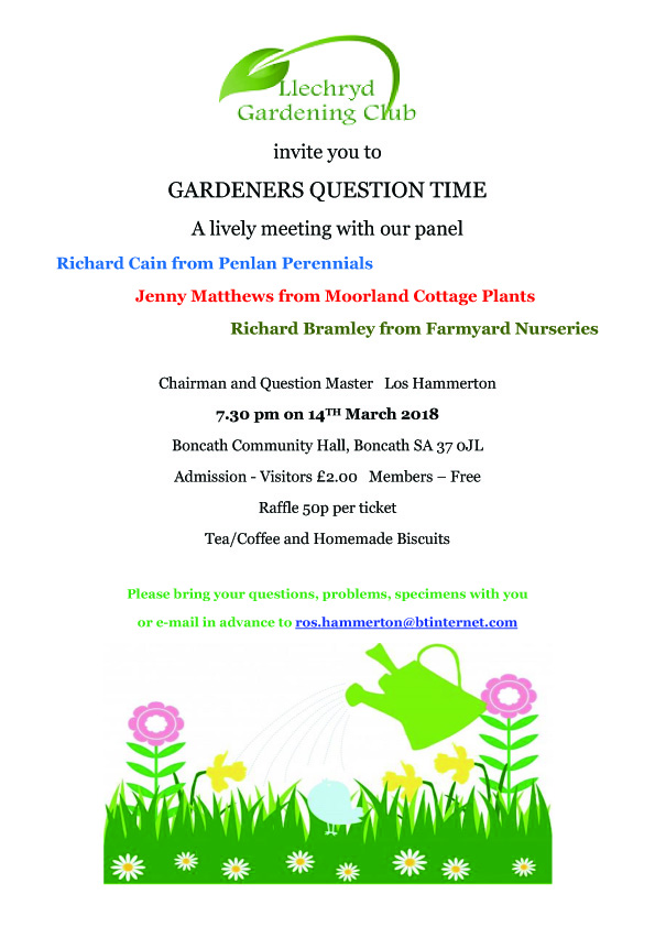Lechryd Gardening Club’s GQT February 20, 2018 / cothigardeners / 1 Comment Lechryd Gardening Club is holding their own version of Gardeners Question Time next month. With Richard Bramley, Richard Cain and Jenny Matthews on the panel it should be an excellent evening and well worth making the effort to go. Share this: Click to share on X (Opens in new window) X Click to share on Facebook (Opens in new window) Facebook Click to email a link to a friend (Opens in new window) Email Click to print (Opens in new window) Print Click to share on Tumblr (Opens in new window) Tumblr Click to share on Pinterest (Opens in new window) Pinterest Click to share on WhatsApp (Opens in new window) WhatsApp Like Loading...
