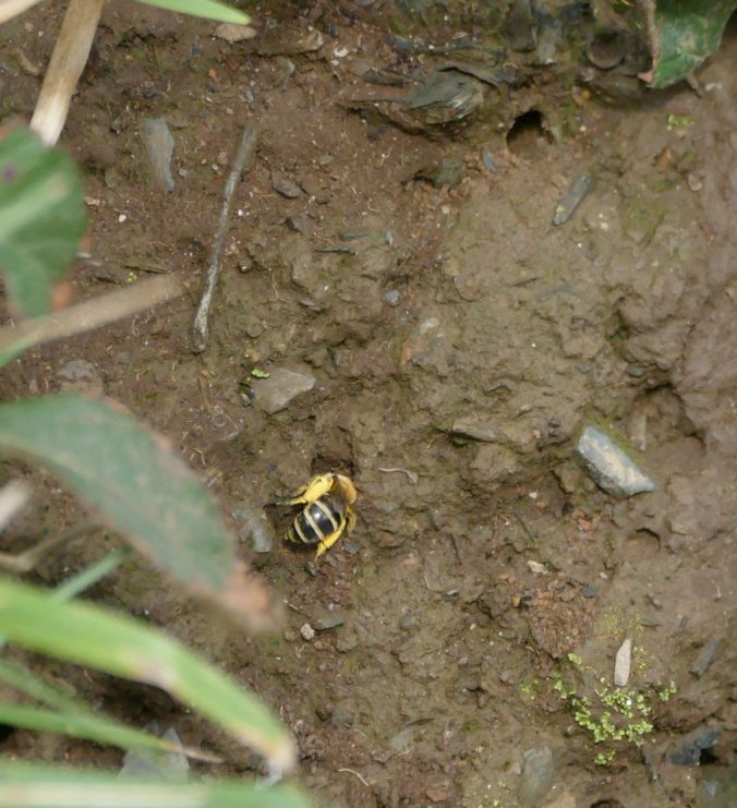 The ones you see here are all mated females taking collected pollen down into the burrows which they’ve just excavated and which house their eggs and then larvae. The pollen will feed the larvae as they mature, pupate and then emerge late next year to begin their new cycle. They aren’t “social” bees so only have a brief annual adult existence. So for anyone with flowering ivy in, or near their gardens, it’s not too late to go and have a look for these recent immigrant bees, if we get a sunny day in the next week or two.