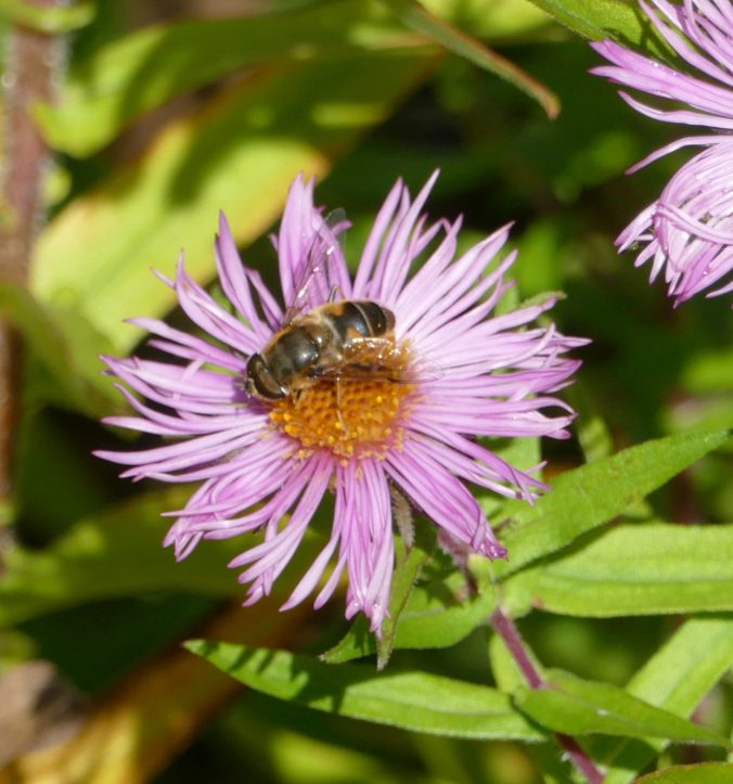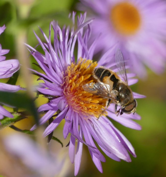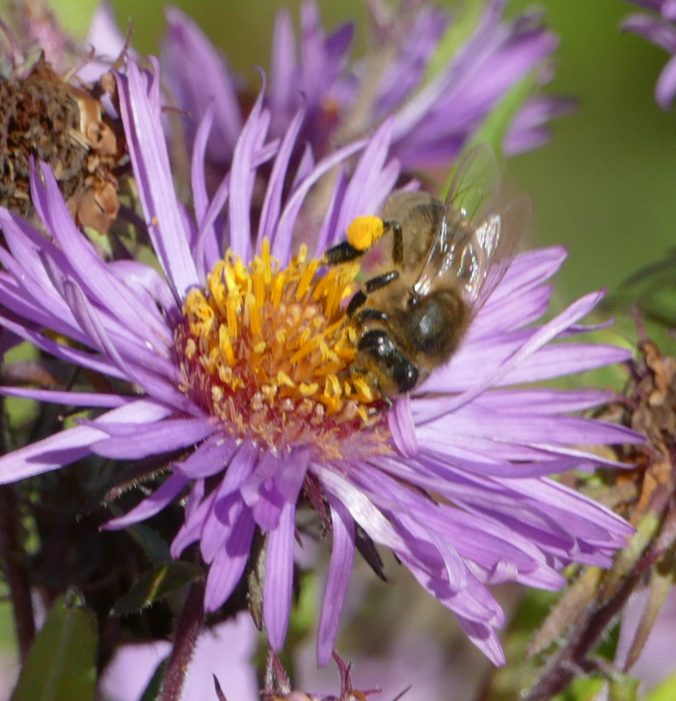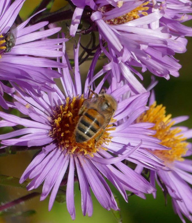 Asters are often mentioned as a great late season nectar source for insects, which they are, but with lots of honeybees around still in our garden, actually very few ever seem to visit the Asters except on a warm sunny day. So for a bit of fun how many honeybees are included in the images below?