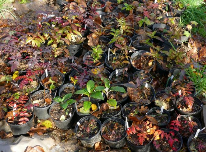 A Cornus kousa chinensis grown from seed (top); a Golden Spirea, and below some of the Hergest Croft trip Sorbus seedlings, showing signs of great potential autumn colour for years ahead.