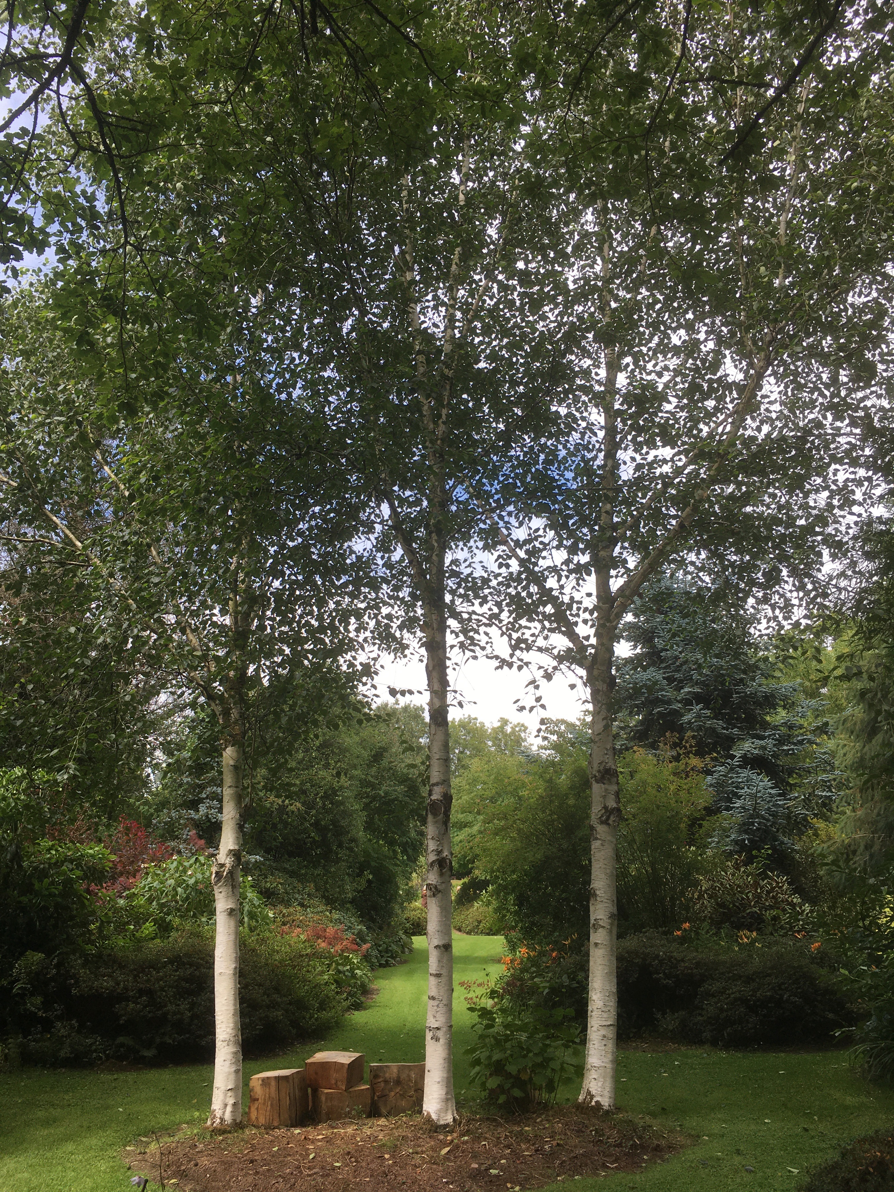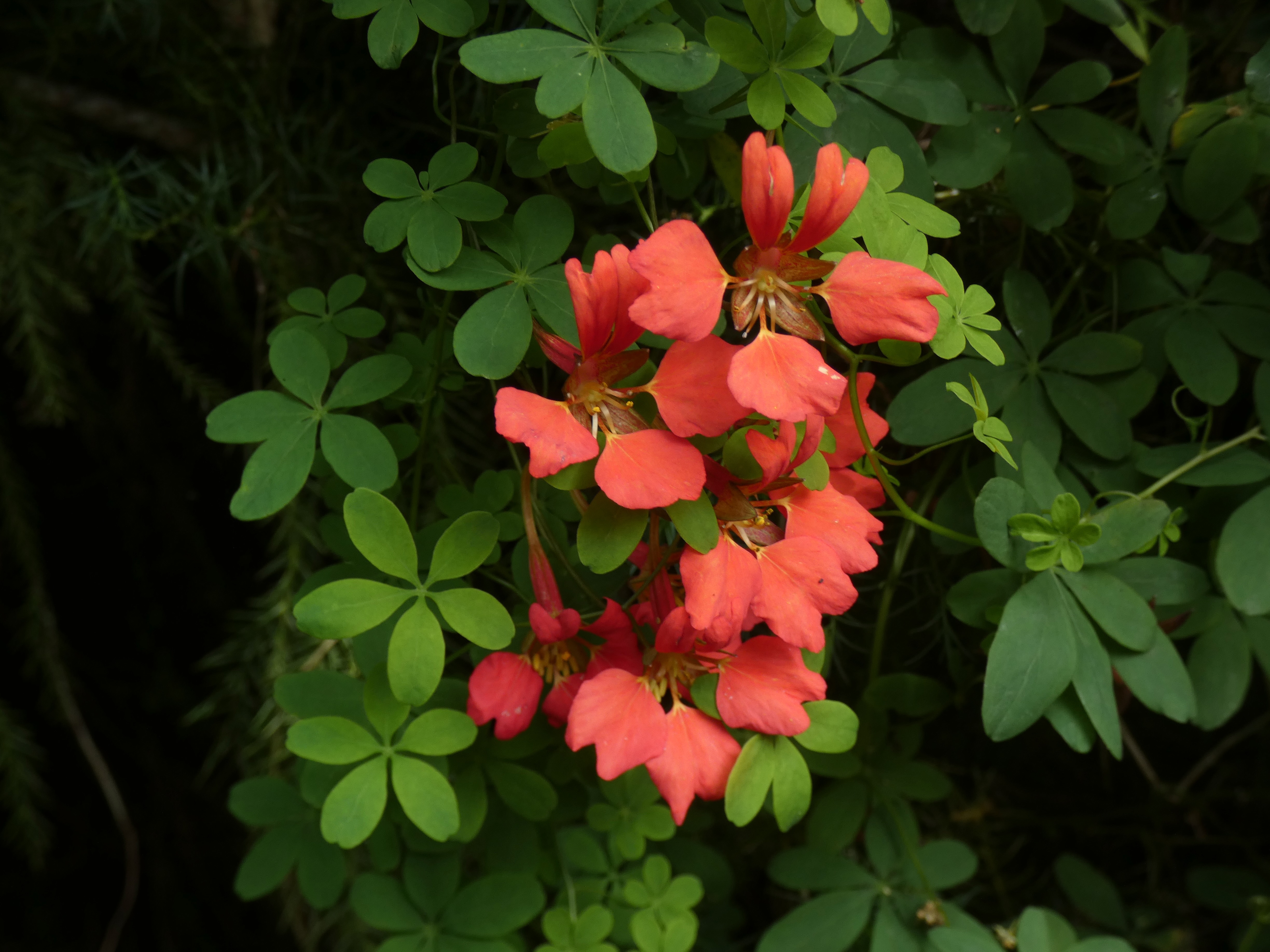 Appropriately, given Paul’s love of bamboos, the garden visit starts with a walk through a bamboo tunnel. This illustrates Liz and Paul’s readiness to adapt with changing climate conditions – it was previously a willow arch, but with time proved too dry for the willows, so they were replaced with bamboo. Willows still play a big role in the garden with various inventive seats and structures made from them. Bamboos are a major feature, with many unusual varieties including Borinda macclureana (a Keith Rushforth collected seedling, now many metres high). There is a real focus on trees (the acers are all grown from seed) and shrubs, particularly rhododendrons, including a number of the large-leaved varieties – many of which also are grown from seed. In mid-July we saw the beautiful and scented Rhododendron auriculatum, the latest flowering species rhododendron. in flower at just 7 years from seed! It was the first time that I have seen the gorgeous scarlet climber Tropaeolum speciosum growing through shrubbery outside Northern Ireland or Scotland.