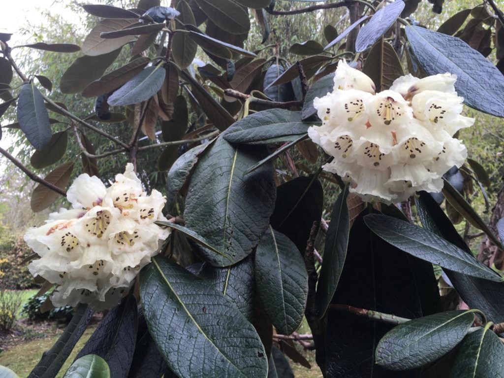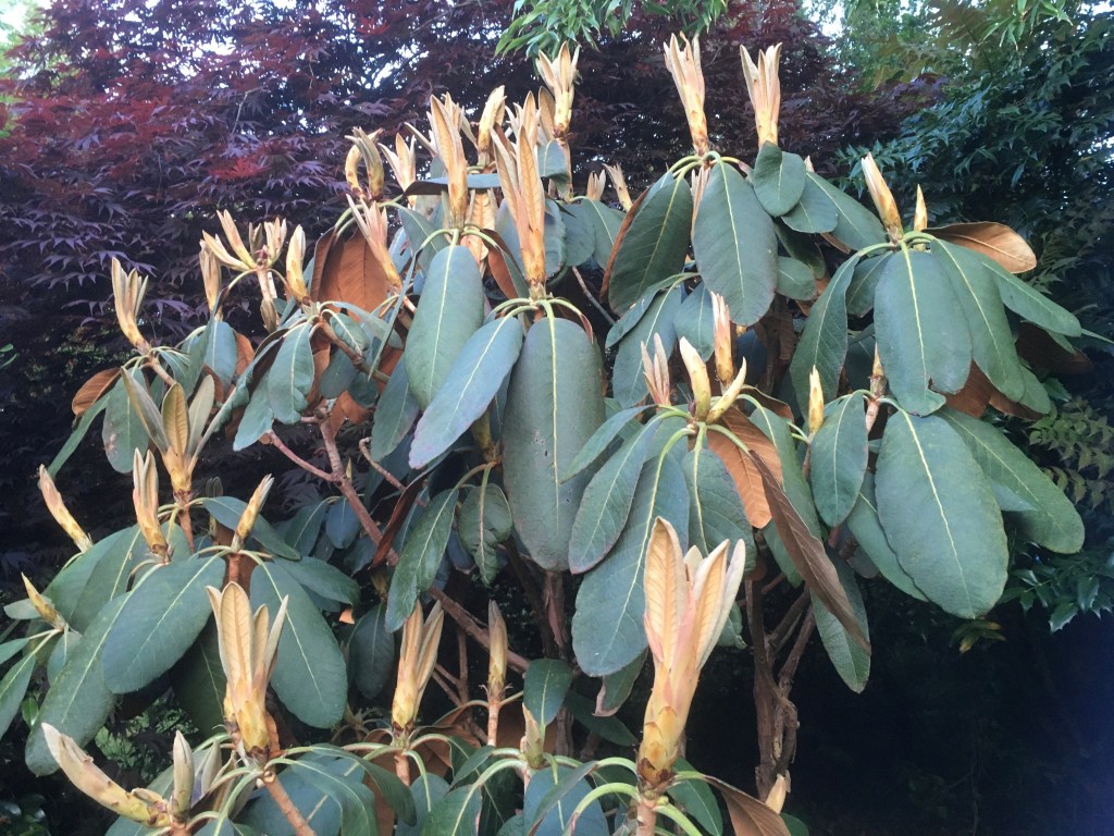 Of the large-leaved rhododendrons, R. falconeri has proved to be the hardiest (it has not suffered in even the coldest temperatures while others, such as R. sinogrande, have). It is a striking plant, with leathery dark green leaves, fawn indumentum when the leaves emerge, deepening to a rusty colour on the underside of the leaves, peeling pinky-brown stems and pale yellow flowers with a maroon blotch. It has not been extremely floriferous here, but the young leaves make up for that as they emerge.