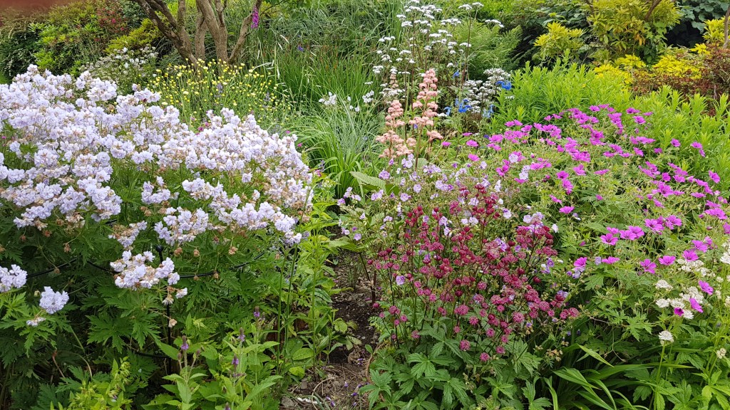 Sally showed us many pictures from her garden of beautiful combinations of hardy perennials and grasses. A group of plants Sally uses widely are the hardy geraniums – including G. ‘Patricia’, G. pratense, G renardii, G. ‘Rozanne’ (which flowers from May to October), and G. ‘Cloud Nine’ raised by Helen Warrington of local Ty Cwm Nursery. The latter is extremely floriferous over a long period, and the bees have an unusual trick to get at the pollen, by making a hole on the underside of the first petal layer.