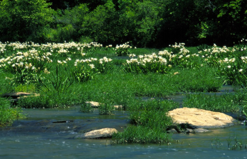 A very different aquatic plant is the Cahaba lily, or aquatic spider lily, hailing from the Cahaba River in Alabama. It flowers in the late afternoon and evening to attract its pollinator, the Trumpet Vine Sphinx Hawkmoth.