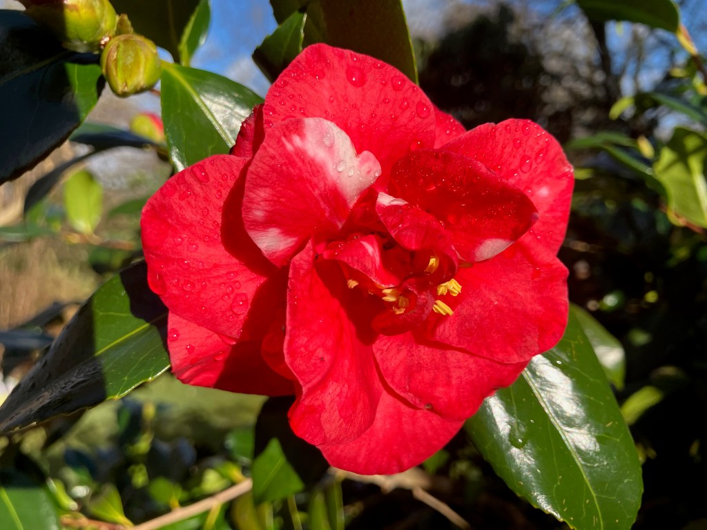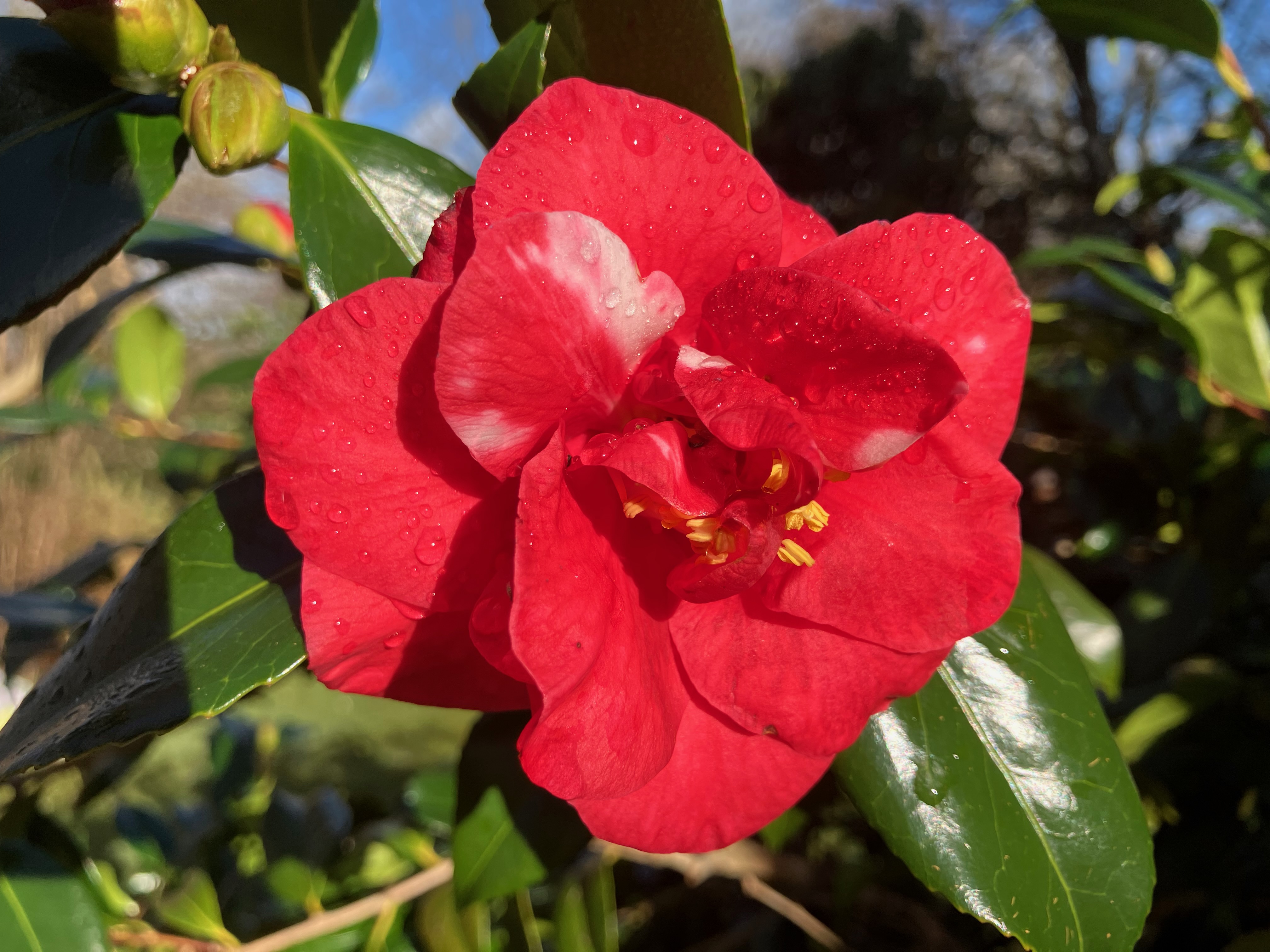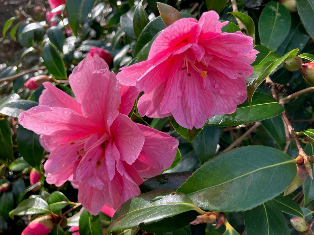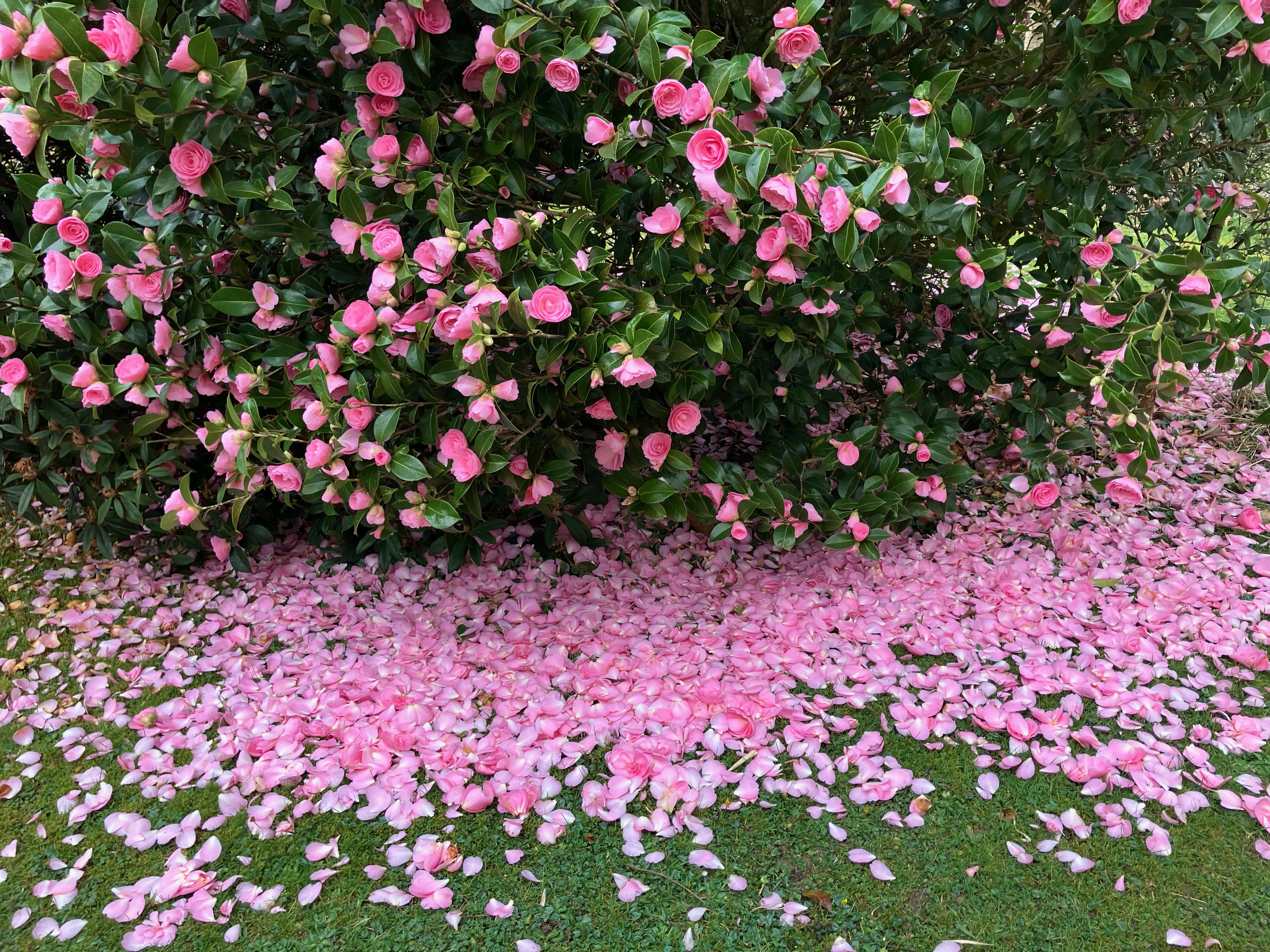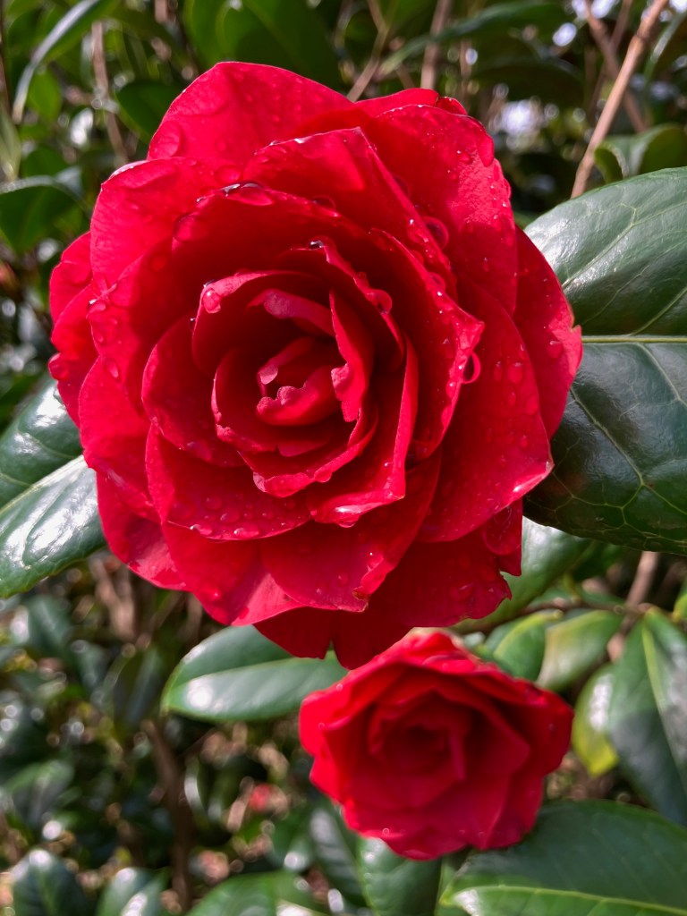 Here is a selection of Camellia photographs – you can see that the flowers are nearly all bedecked with raindrops – an indication of the weather we have been having. One of the advantages of the hybrid Camellias, unlike the japonicas, is that they nearly all drop their flowers when done, rather than hanging on to them as they turn brown; the disadvantage is that wet and windy weather can bring them down early.