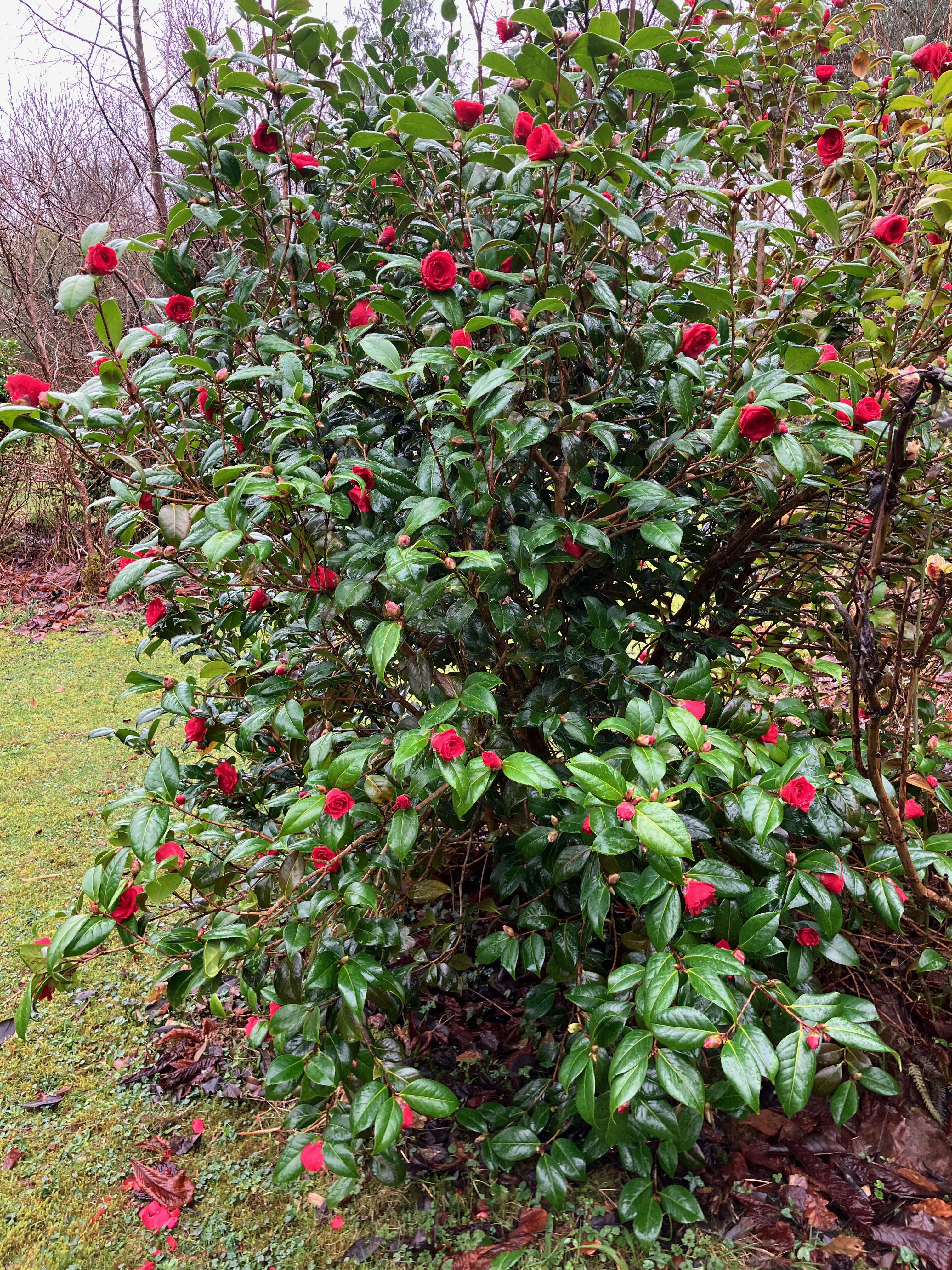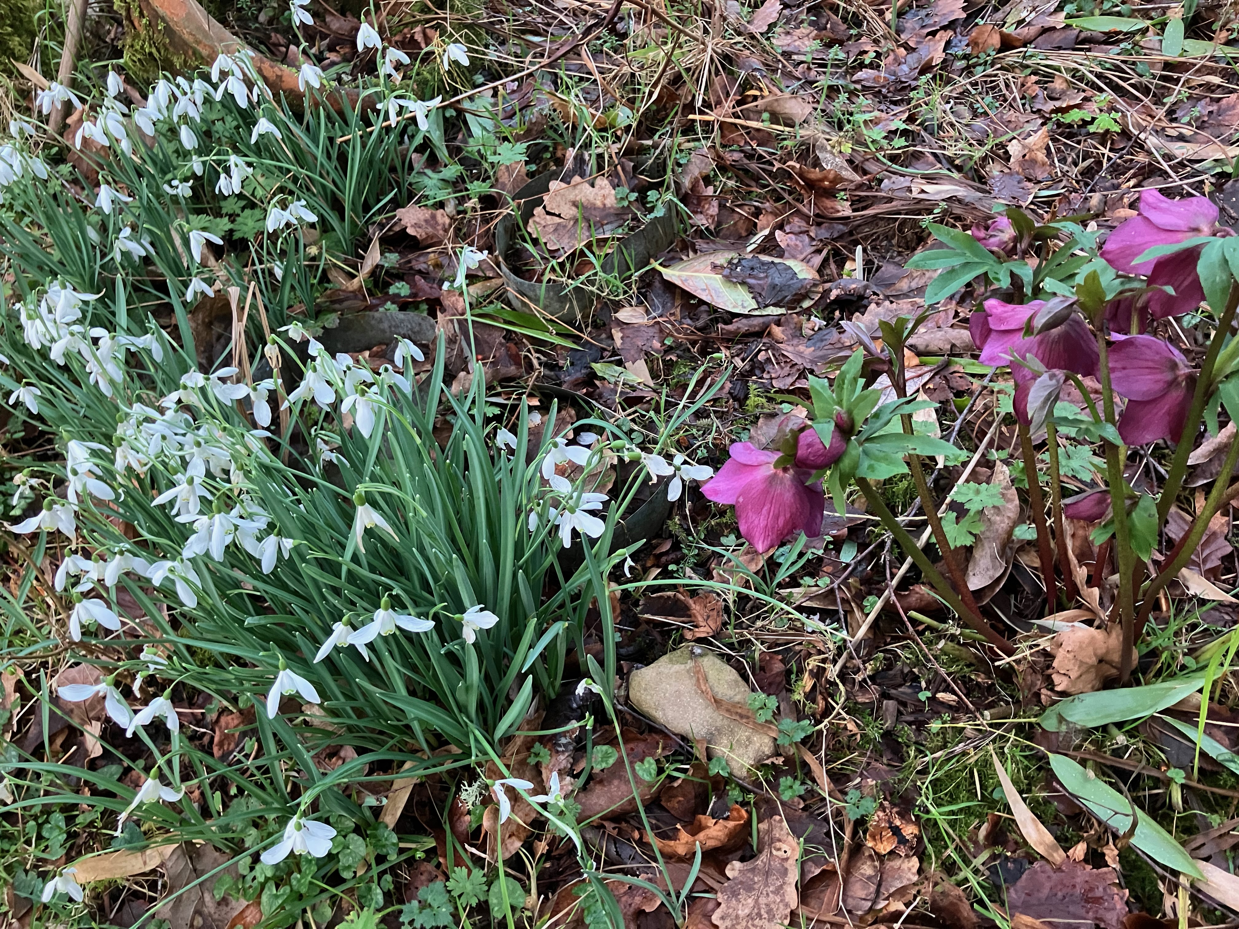 Apart from a week of crisp, frosty weather in the second week of January, 2024 has continued the soggy theme of the previous few months, in contrast to the previous February. Damp usually means mild, and I think this is the first year that Camellia x williamsii ‘St Ewe’ had its first flowers by Christmas. By early January, it was quite well in flower, along with Parrotia persica ‘Vanessa’ with its tiny spidery red flowers. Perfume was provided by Daphne bholua and Sarcococca confusa, and colour at ground level by snowdrops and the first hellebores.