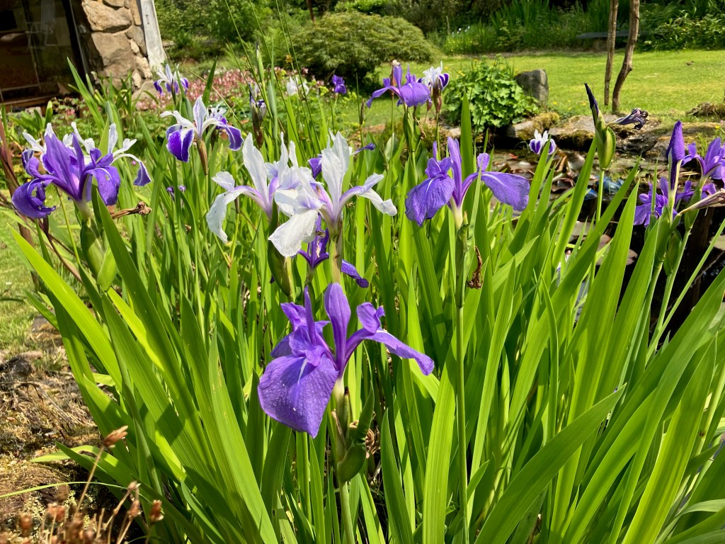 June did not bring any better weather, but the irises in the pond enjoyed the rain. The roses, predictably, less so. Early June often feels a bit strange in the garden, when you have two seasons in one with the later flowering rhododendrons and azaleas being joined by the summer roses.