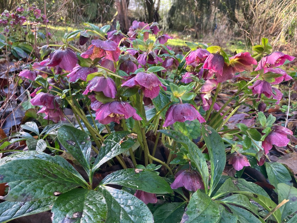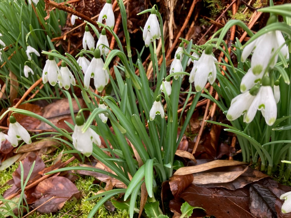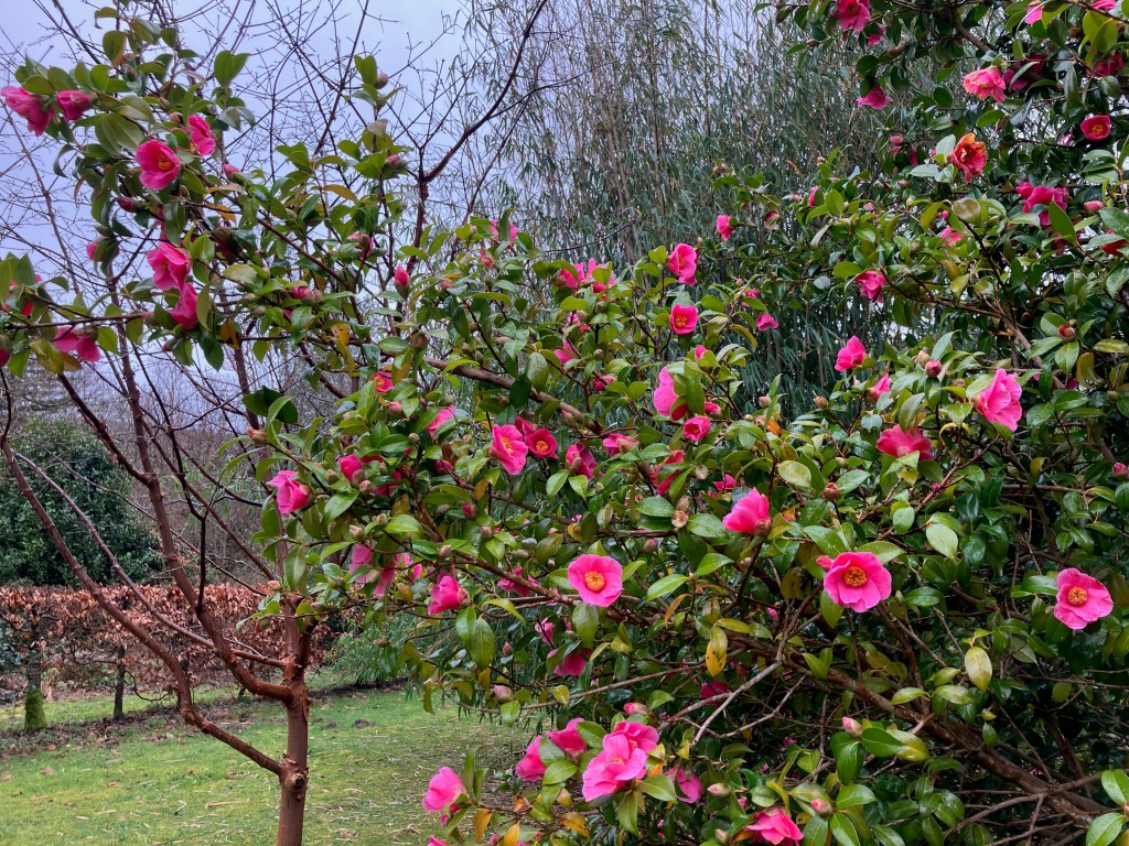 Despite the greyness and fairly chilly temperatures, the winter-flowering plants can sense the rhythm of the seasons; by the end of the month there is a perceptible increase in daylight length. So the early snowdrops, hellebores and camellias are out.