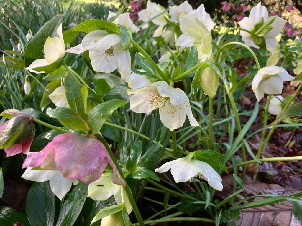 More camellias came into flower, and there were increasing numbers of snowdrops and hellebores, doing their best to compensate for the continuous cloud bringing never-ending rain, courtesy of blocking high pressure over Scandinavia.