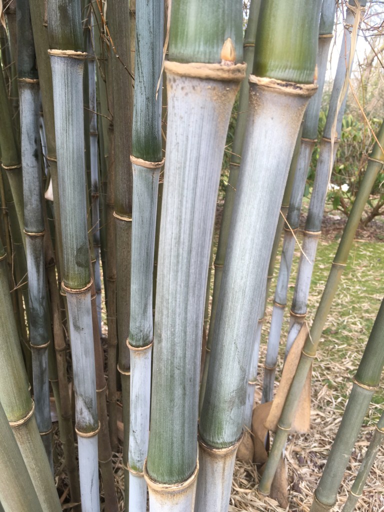 Those low temperatures, particularly in December, have been damaging for some plants. The jury is still out on ultimate survival, but very badly damaged plants include: Borinda papyrifera (pictured on the left, with very fine grey-green stems, the most impressive bamboo in the garden by far); Rhododendron sinogrande, Eucalyptus (probably globulus) and Drimys winteri. I’m keeping my fingers crossed – I would hate to lose any of them. Many of the other evergreens have dropped a lot of leaves – other large-leaves rhododendrons, some camellias, and the Daphne bholua.