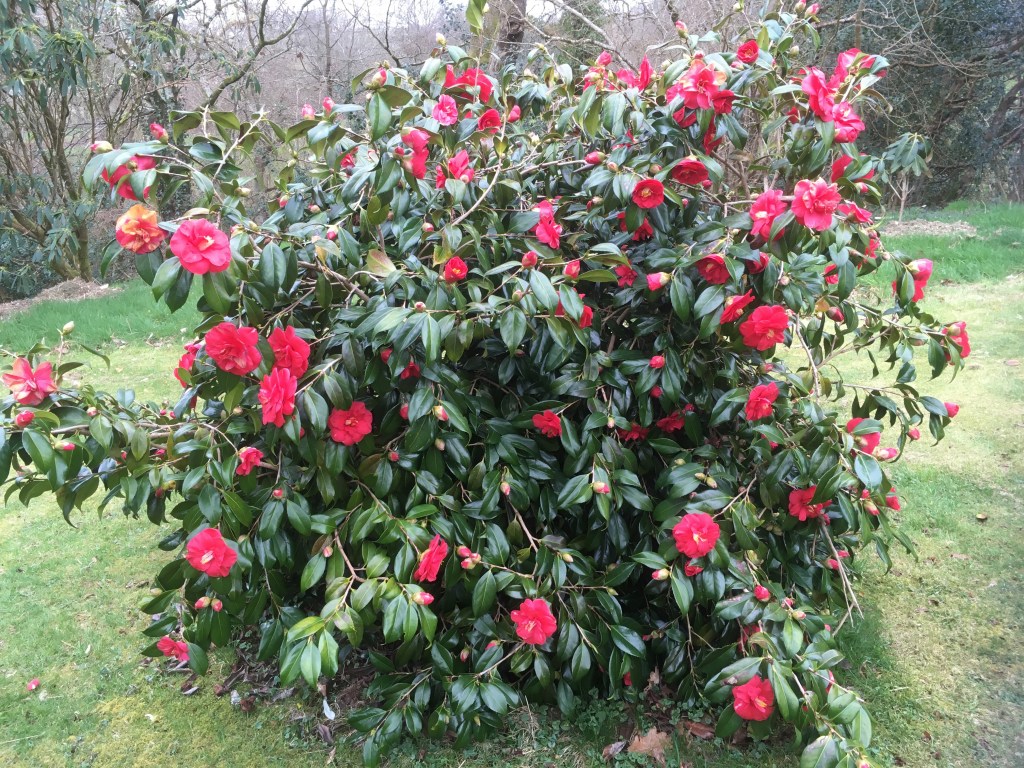 In the end, March was the wettest for forty years, which was not hard to believe. There has been a dry interlude over the Easter weekend, since when the weather has been more autumnal than spring-like. The Camellias like this weather no better than the Magnolias, and in many cases the ground beneath the bushes is carpeted in petals. I managed to take these pictures in early April in the brief interlude between the rains.
