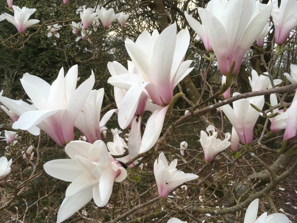 The other story of the month is provided by the Magnolias. The larger-leaved Magnolias are the first into flower, although they are more susceptible to bad weather (this year the very heavy rain and wind in early mid-April). I have no names for the two Magnolias below, but they are very beautiful.
