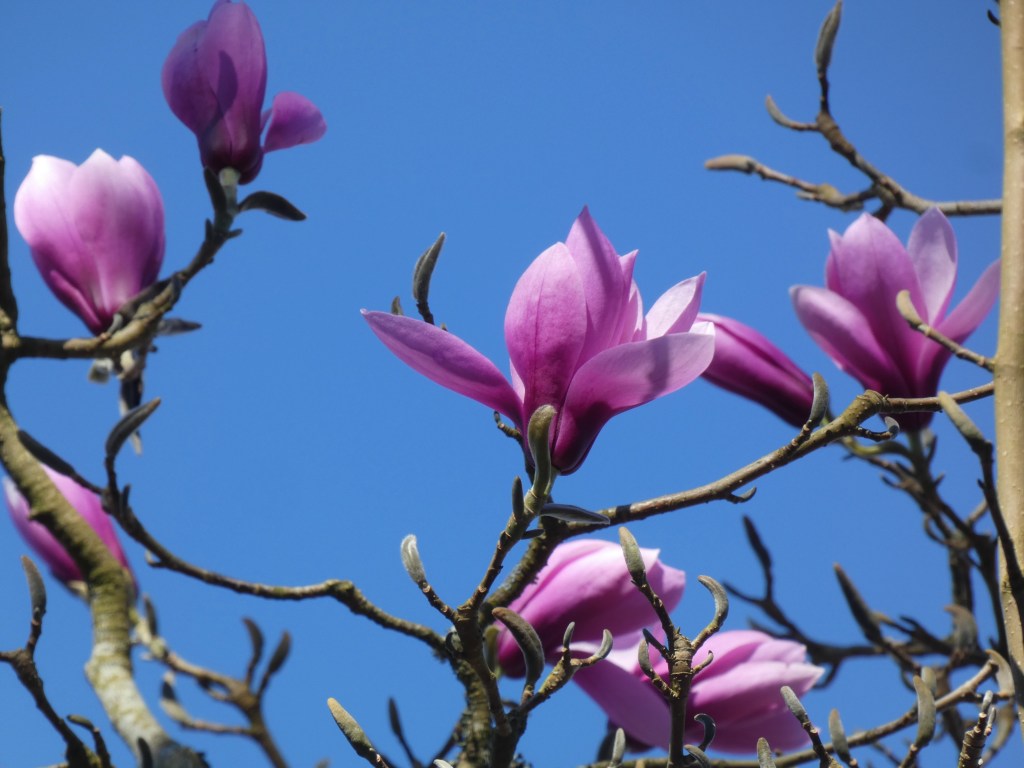 By the third week of the month, the furry casing was starting to fall from some of the Magnolia buds. The first Magnolia into flower is always what I bought as M. sargentiana var. robusta alba – although it patently isn’t ‘alba’, with magenta buds which open to large, floppy flowers of a palish, almost lilac pink; I think from the shape of the tree and flowers that it definitely has M. sargentiana var. robusta in its parentage.