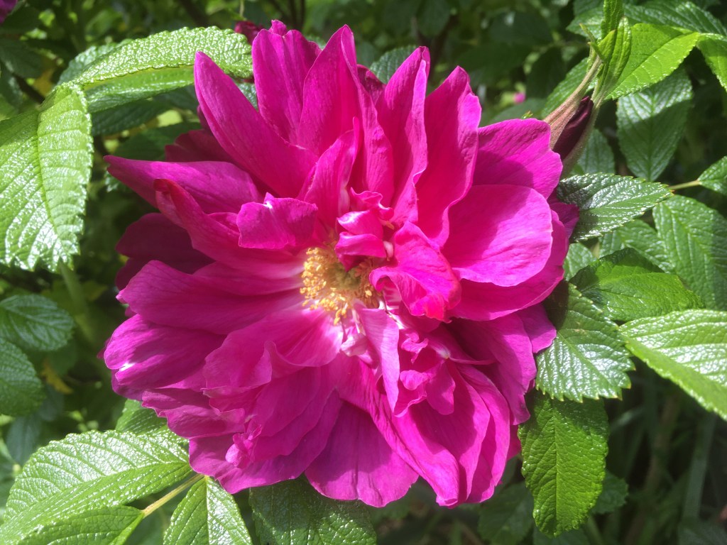 It doesn’t have the large orange berries of single rugosa varieties, but it makes up for that in the depth of colour of the flowers and their scent – in this country their petals are frequently used for making rose petal jam.
