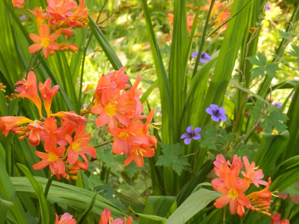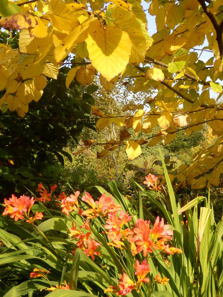 Meteorological autumn ushered in a period of summer-like weather with sunshine and warmth. This encouraged the late-flowering Crocosmia ‘Severn Sunrise’ into flower, its lovely soft orange complementing yellow birch leaves, the blue of the hydrangeas still going strong, and late blue and mauve geraniums.
