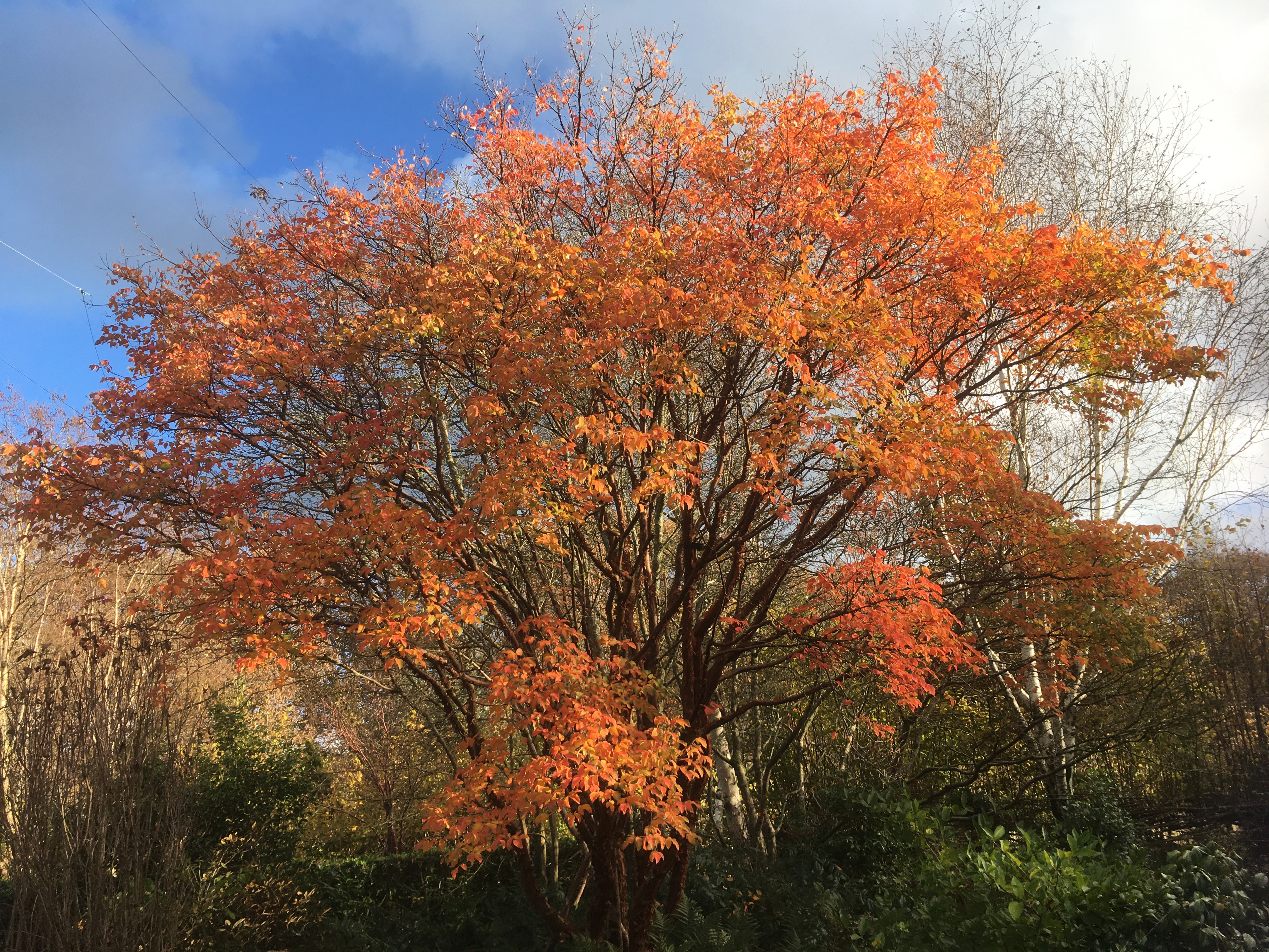 Despite what I thought in October, it has actually been quite a good year for autumn colour – surprisingly given the seemingly endless rain and lack of frost or sunny days. Acers have been ably accompanied by a sorbus, liquidambar, tulip tree and handkerchief tree. The latter two trees are beautiful in their own right, but we are still waiting for either of them to flower a considerable number of years on from planting them! I also enjoy the tapestry of fallen coloured leaves on the ground at this time of year.