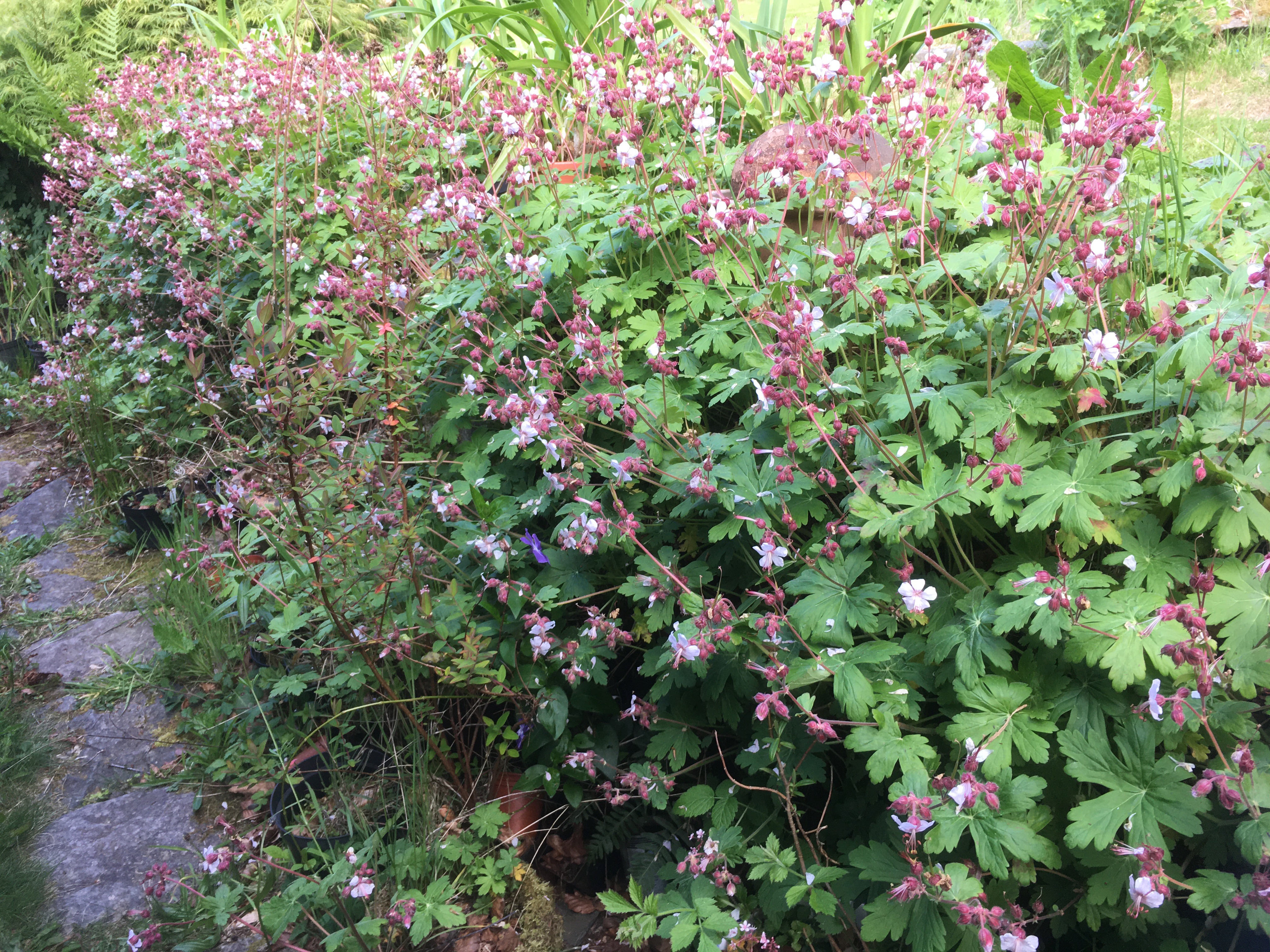 May is absolutely my favourite month of the year in the garden, a feast for the senses whatever the weather, but this year it has been particularly favourable (although I worry now that the blackbirds and song thrushes would benefit from some rain to help feed their young). For many of the month’s delights, including the colour and scent of the bluebells around the edges and the birdsong, I can, of course, take no credit. There is also the gentle hum of the bees – the various bumble bees, particularly in the comfrey and geraniums (Geranium macrorrhizum ‘Ingwersen’s Variety’), and the honey bees in the trees – the hollies and acers.