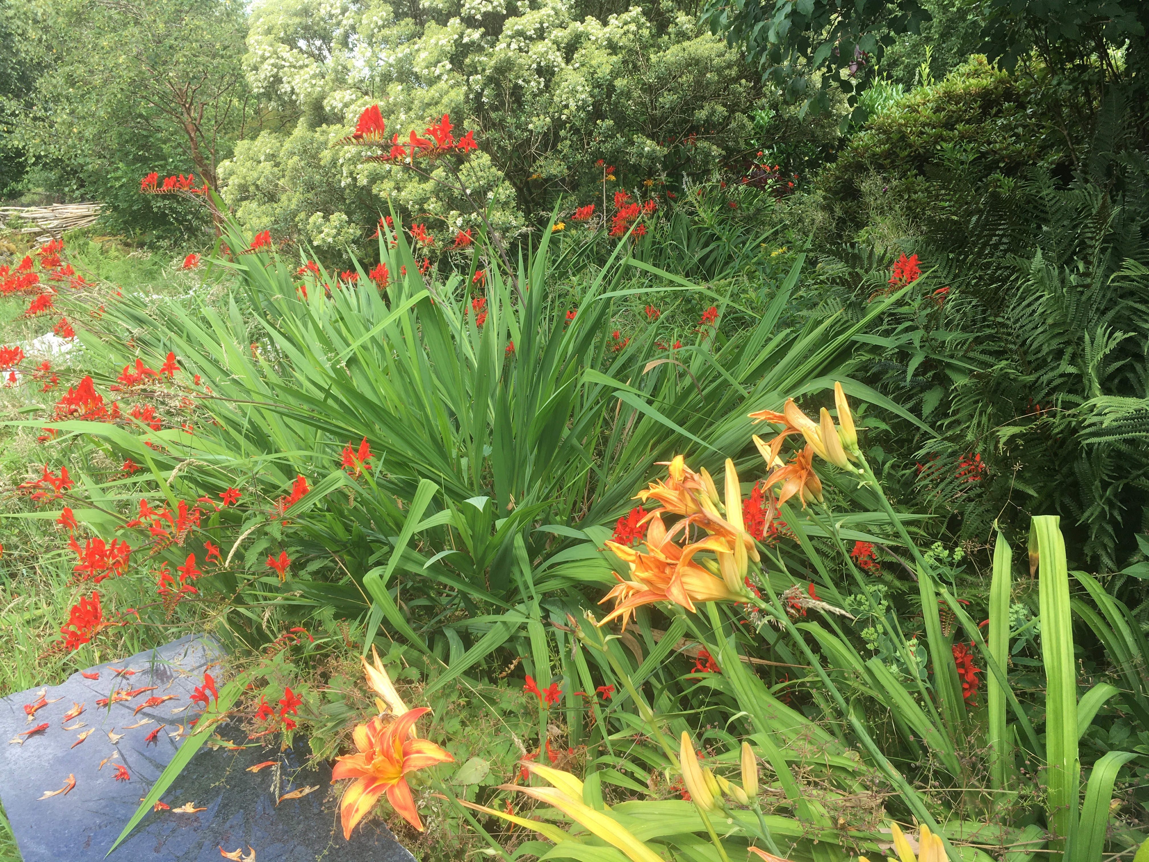 Other plants in bloom at the moment include Crocosmia and Hemerocallis, standing up quite well to their battering by the rain.