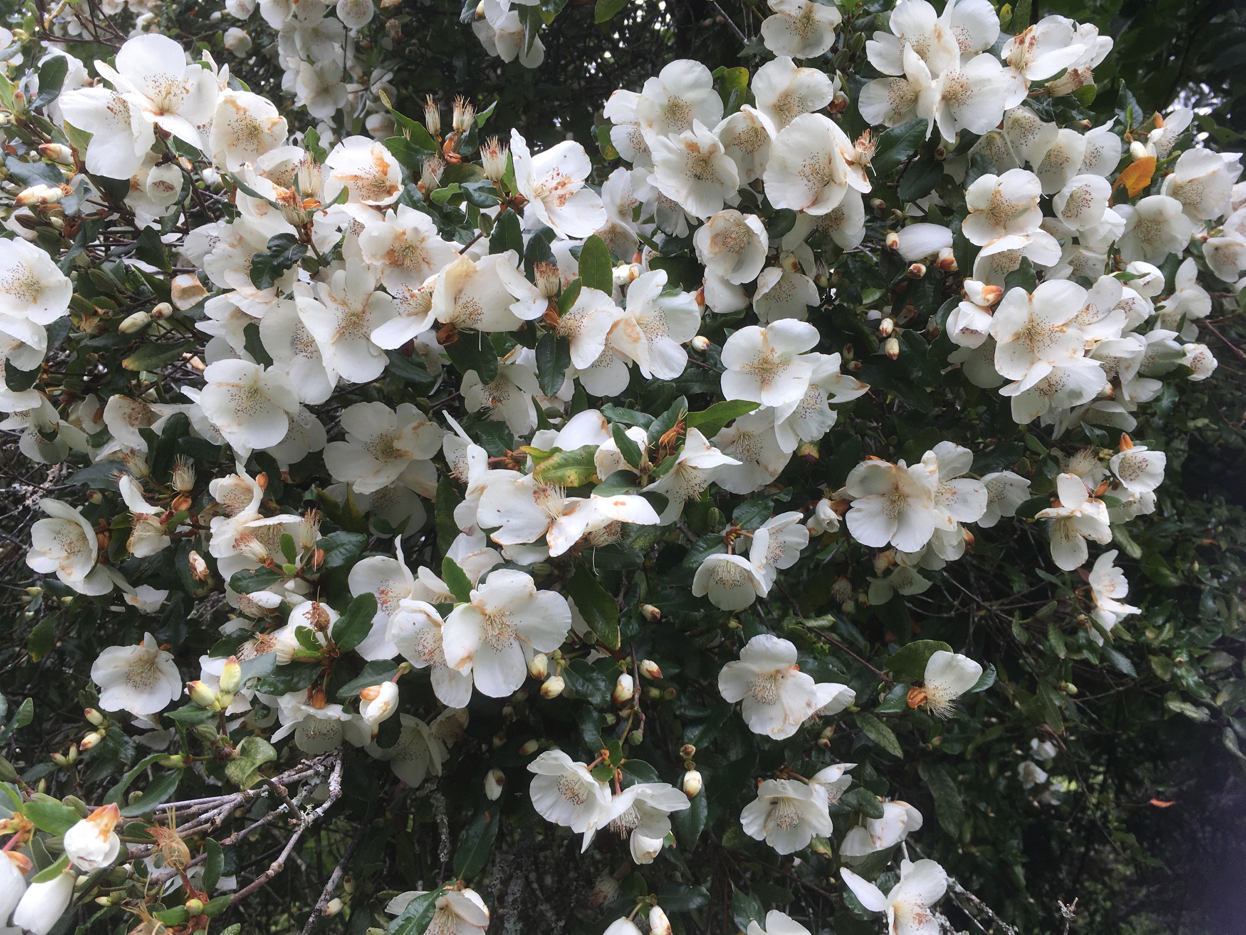 Eucryphias are another star of the show this month. I have found the most reliable in this garden to be Eucryphia x intermedia ‘Rostrevor’; although the flowers are smaller than some other varieties, it can be completely covered.