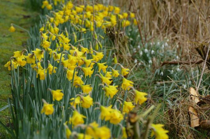 Every section of the garden includes wild flowers, which are either a legacy from the meadow seedbank or sown by the birds. These include red campion, ribwort plantain, and ox-eye daisies, with the addition of native ferns (which were always there) and Epimedium x versicolor ‘Sulphureum’. You have to be selective and choose plants which will work well together.